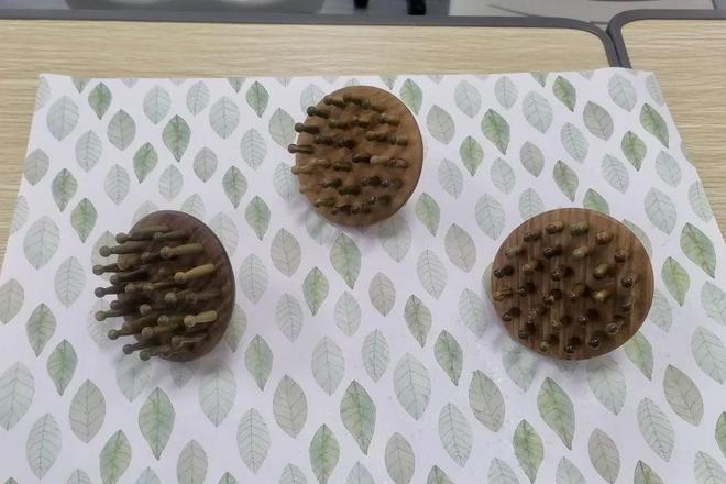 在实践环节中,学员们每人领取了一份绿檀木梳背与28根特制梳齿。据介绍,梳齿数量对应人体28处主要经络穴位,暗合中医养生智慧。学员们屏息凝神,将梳齿蘸取专用胶水后,逐一对准孔眼旋入梳背。绿檀木特有的辛香气息萦绕全场,为手作过程增添了一份雅致。制作完成后,学员们迫不及待地体验“作品成果”。28根梳齿如同“温柔之手”轻触头皮,带来微酸胀感的按摩体验。“亲手制作的梳子不仅实用,更让人体会到传统工艺的细腻与匠心。”活动现场,有参与者感叹。