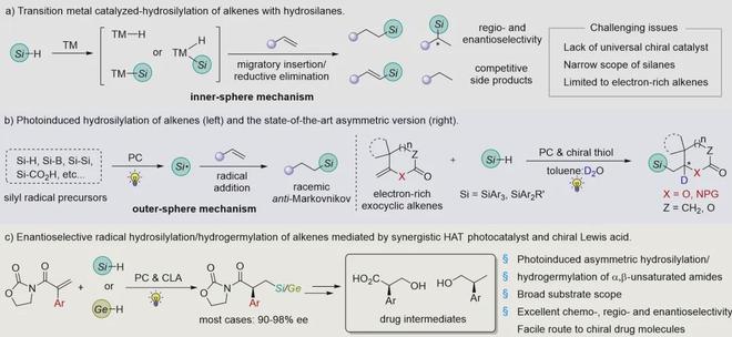 光化学的兴起为烯烃的硅氢化反应提供了新平台。在光照条件下,基于硅自由基的烯烃硅氢化反应适用于Si-H,Si-B,Si-Si等多类有机硅化合物以及富/缺电子烯烃,区域专一性得到反马氏加成产物(图1b,左)。但由于反应涉及高活性的自由基中间体,立体选择性控制是一个很大挑战。目前,已报道的例子仅限于利用手性硫醇催化富电子环外烯烃的不对称硅氘化反应(图1b,右)(Nat. Commun. 2022, 13, 4453, Org. Chem. Front. 2023, 10, 1182)。