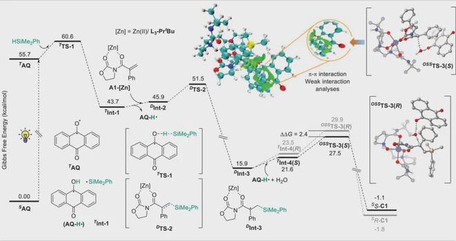 理论计算研究进一步阐释了该催化反应过程(图7)。光照使基态蒽醌(AQ)首先跃迁至激发单重态(SAQ),随后通过系间窜越到达激发三重态(TAQ)。与硅烷发生氢原子转移(HAT),生成硅自由基和半醌自由基中间体(AQ-H·)。计算表明,经Lewis酸活化的烯烃底物(A1-[Zn]络合物)与硅自由基发生加成,形成关键的自由基中间体(DInt-3)。随后的转化过程涉及AQ-H·与Dint-3之间的单电子转移(SET),生成碳负离子中间体,并在水分子的作用下完成对映选择性控制的质子转移。弱相互作用分析证实了烯烃苯环与AQ之间的π-π相互作用,这种空间效应是反应的对映选择性控制的重要因素。