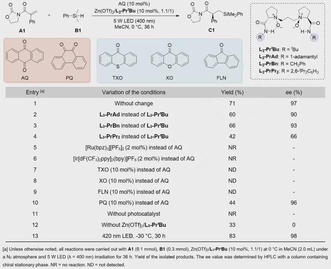 以苯乙酸衍生的烯烃A1和二甲基苯基硅烷B1作为模板底物,对反应条件进行优化。通过考察光源、光催化剂、温度、金属盐、配体和底物比例等,确定了最优反应条件:9,10-蒽醌(AQ,10 mol%)和Zn(OTf)₂/L3-PrtBu(10 mol%)为协同催化剂,乙腈为溶剂,在-30 ℃和5 W,420 nm,光照条件下反应,以83% 收率和98% ee得到目标产物C1。其中传统金属类光催化剂(如Ru/Ir配合物)及二苯甲酮类光催化剂(TXO、XO和FLN)均未能有效催化该反应。而结构相似的醌类光催化剂PQ能以44%收率和96% ee得到目标产物(图2)。
