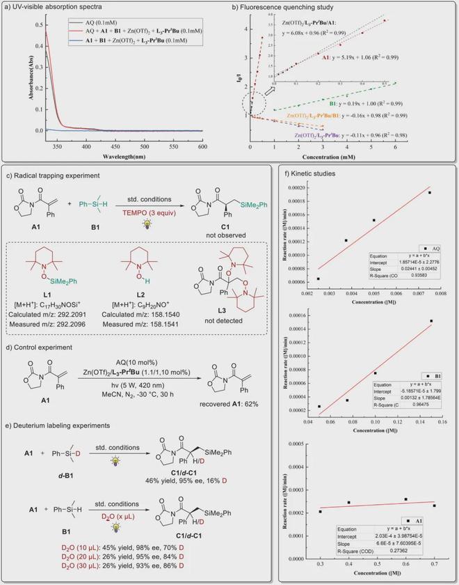 通过机理实验详细探究了反应历程(图6)。(a) 紫外-可见吸收光谱证实仅有蒽醌(AQ)在420 nm处具有特征吸收。(b) 荧光淬灭实验观察到烯烃(A1)与硅烷(B1)对激发态AQ的竞争性淬灭现象。(c) 自由基捕获实验证明了反应经历了自由基历程。(d) 无硅烷条件下仅能回收62%的A1,也证明了烯烃对AQ的淬灭作用。(e) 在氘代实验中,使用d-B1时产物氘代率仅16%,而添加D2O后氘代率显著提升且呈剂量依赖性,表明体系中存在的微量水参与反应。(f) 动力学实验结果表明,反应速率仅与AQ和B1浓度相关,与A1无关。除上述实验外,反应的量子产率实验为0.014,排除了链式反应机理。通过循环伏安法测得HSiMe2(p-CF3Ph)电势为 +2.37 V (vs. SCE),无法被激发态的蒽醌氧化(E(AQ*AQ·¯) = +1.77 V),从而确定硅自由基的产生经历直接氢原子转移过程。