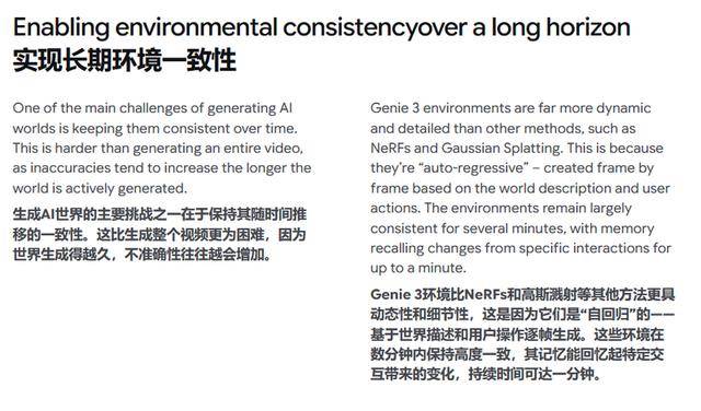 Genie 3目前仅拥有约1分钟的“视觉短时记忆”。这意味着,它无法维持一个长期的、连贯的游戏世界。